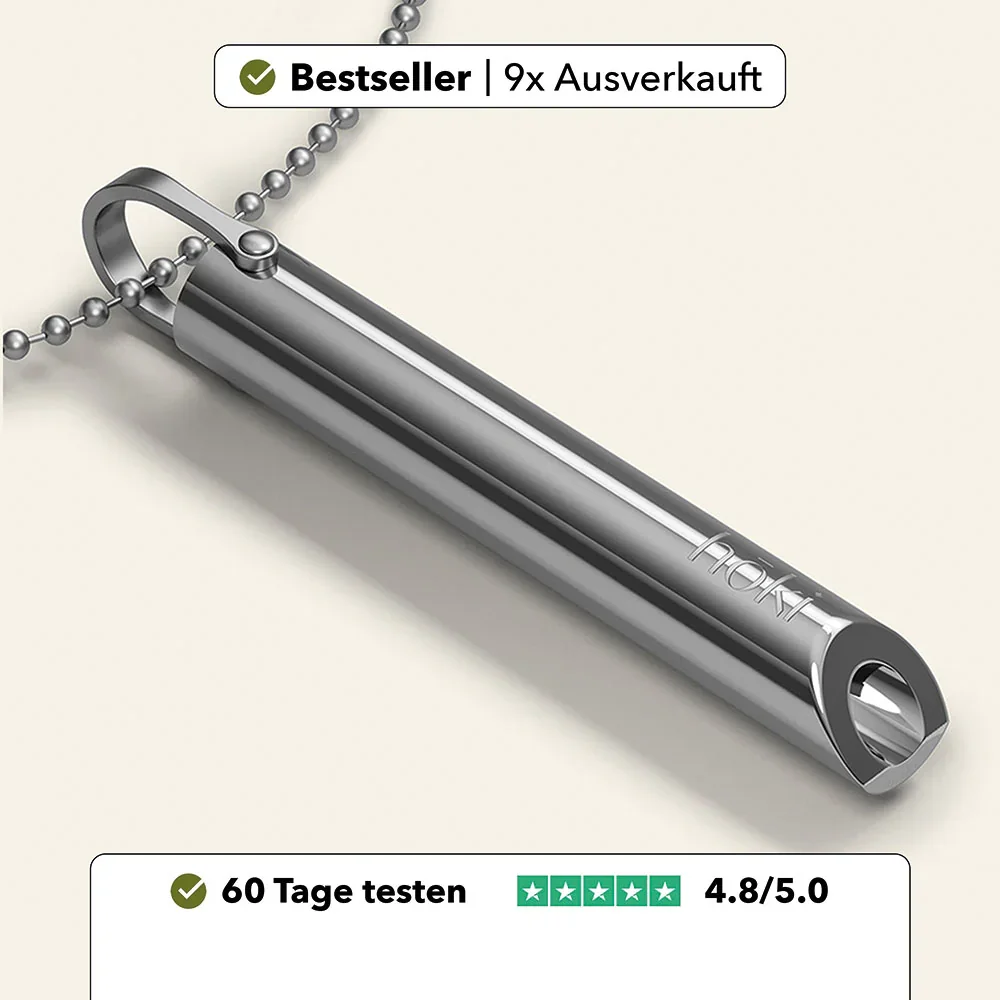 Sebastians Inspiration für die Halskette hōki® war es, eine effektive, natürliche und portable Lösung gegen Panikattacken zu schaffen. Das Herzstück des Produkts ist das StressLess-Design, das durch gezieltes Ausatmen den Vagusnerv stimuliert und so eine natürliche Entspannungsreaktion auslöst. Die elegante Kette ist sowohl ein praktisches Tool als auch ein stilvolles Accessoire – immer griffbereit, egal ob zu Hause, im Büro oder unterwegs.